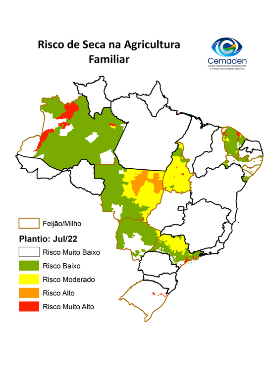 O mapa de risco de seca para a agricultura familiar é elaborado mensalmente a partir das variáveis físicas de ameaça de seca, tais como o déficit de precipitação, umidade do solo e índice de vigor vegetativo, combinadas com informações sobre as vulnerabilidade e capacidades locais da agricultura familiar.