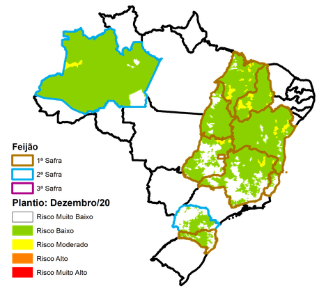 A Figura I mostra o risco para o plantio realizado no mês de fevereiro/20, o qual indica um total de 20 municípios com risco alto, distribuídos nos estados do Pernambuco (11), Paraíba (5), Bahia (3) e Rio Grande do Norte (1). Os mesmos estados também apresentaram 443 municípios com risco moderado, já no primeiro mês de plantio o que indica um estado de atenção. Por outro lado, as demais regiões apresentaram risco majoritariamente entre baixo e muito baixo. A Figura II mostra o risco considerando o plantio realizado em janeiro, o qual aponta que fevereiro tem sido o mês mais crítico do ciclo. No geral, a Região Nordeste se destaca pelo maior número de municípios com o risco moderado (310), distribuídos entre os estados da Bahia (41), Ceará (98), Maranhã (43), Paraíba (110) e Piauí (18). Por fim, a Figura III apresenta os estados e municípios onde o calendário de plantio teve o inicio no mês de dezembro e, portanto, encerraram o ciclo em dezembro. Esse ciclo finalizou sem nenhum município apresentando risco muito alto ou alto, contudo ressalta-se que o índice é específico pra cultura de feijão (ciclo de 90 dias) e o risco é calculado por meio de variáveis ambientais e socioeconômicas. No total foram 72 municípios classificados com risco moderado, ou seja, com maiores chances de um possível impacto na agricultura familiar, sendo 72 deles da região Nordeste (32 Bahia, 19 Maranhão e 21 Piauí). Ressalta-se que as regiões da Figura I e II, com safra vigente, finalizarão o ciclo do feijão no mês de março e abril, respectivamente; e os municípios categorizados com risco moderado e alto são aqueles com maiores chances de um possível impacto na agricultura familiar.
