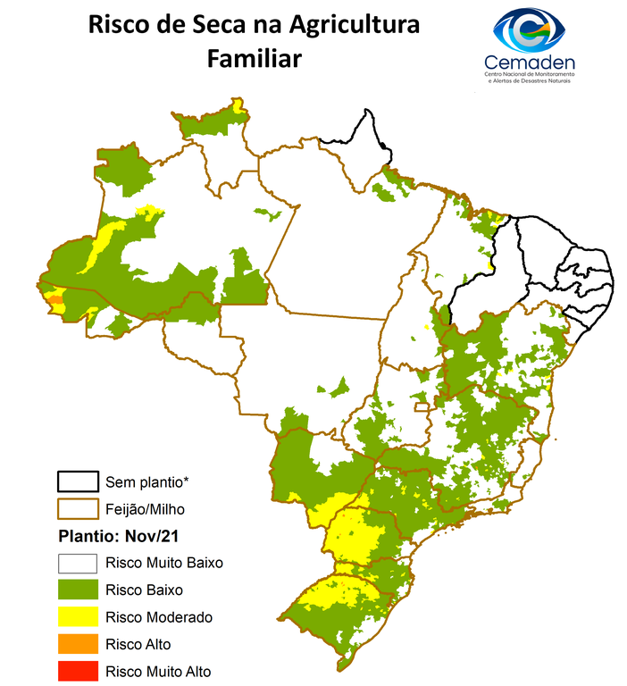 O mapa de risco de seca para a agricultura familiar é elaborado mensalmente a partir das variáveis físicas de ameaça de seca, tais como o déficit de precipitação, umidade do solo e índice de vigor vegetativo, combinadas com informações sobre as vulnerabilidade e capacidades locais da agricultura familiar.