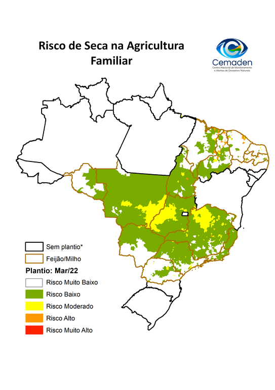 O mapa de risco de seca para a agricultura familiar é elaborado mensalmente a partir das variáveis físicas de ameaça de seca, tais como o déficit de precipitação, umidade do solo e índice de vigor vegetativo, combinadas com informações sobre as vulnerabilidade e capacidades locais da agricultura familiar.