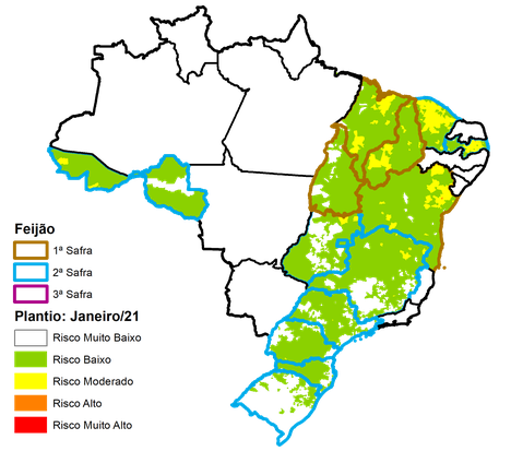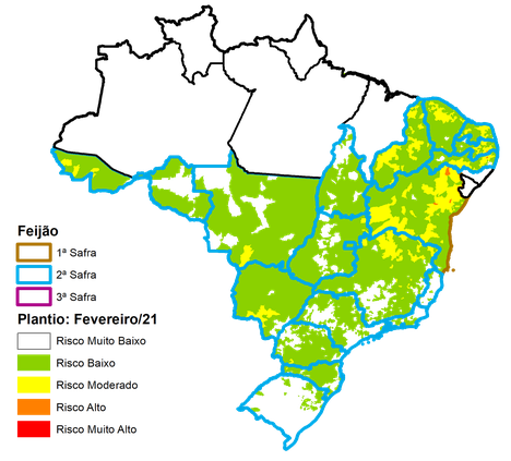 A Figura I mostra o risco de seca para o plantio realizado no mês de março/20, o qual indica um total de 20 municípios com risco alto. Estes municípios estão distribuídos nos estados da Bahia (14), Maranhão, Paraíba (2) e Piauí (2). Os mesmos estados também apresentaram 385 municípios com risco moderado, já no primeiro mês de plantio o que indica um estado de atenção. Por outro lado, as demais regiões apresentaram risco majoritariamente entre baixo e muito baixo, com exceção de Minas gerais que apresentou 106 municípios com risco moderado. A Figura II mostra o risco de seca considerando o plantio realizado em fevereiro, o qual aponta que fevereiro tem sido o mês mais crítico do ciclo. No geral, a Região Nordeste se destaca pelo maior número de municípios com o risco moderado (406), distribuídos entre os estados da Bahia (150), Piauí (68), Pernambuco (55), Paraíba (54), Rio Grande do Norte (41) e Ceará (38). Por fim, a Figura III apresenta os estados e municípios onde o calendário de plantio teve o início no mês de janeiro e, portanto, encerraram o ciclo em março. Esse ciclo finalizou sem nenhum município apresentando risco muito alto e apenas 3 municípios inseridos na região Nordeste com risco alto. Contudo ressalta-se que o índice é específico pra cultura de feijão (ciclo de 90 dias) e o risco é calculado por meio de variáveis ambientais e socioeconômicas. No total foram 408 municípios classificados com risco moderado, ou seja, com maiores chances de um possível impacto na agricultura familiar, sendo 380 deles na região Nordeste (78 Ceará, 41 Maranhão, 99 Paraíba, 63 Pernambuco, 25 Piauí e 74 Rio Grande do Norte). Ressalta-se que as regiões da Figura I e II, com safra vigente, finalizarão o ciclo do feijão no mês de abril e maio, respectivamente; e os municípios categorizados com risco moderado e alto são aqueles com maiores chances de um possível impacto na agricultura familiar.