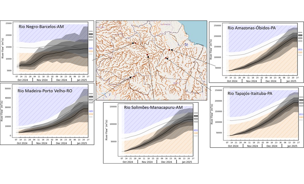 A previsão de vazão para o trimestre NDJ de 2024, conforme o modelo global de vazão, conhecido como Global Flood Awareness System (GloFAS), aponta para um aumento das vazões nos rios que compõem a bacia Amazônica, em função da estação chuvosa projetada para a região. Contudo, espera-se que as vazões (representadas pela linha preta contínua) permaneçam abaixo da média climatológica (indicada pela linha preta pontilhada) na região Norte ao longo dos próximos três meses. Essa condição inclui os rios Negro e Madeira, situados no oeste da bacia, o rio Solimões na porção central, e os rios Amazonas e Tapajós na região leste (Figura 4). Cabe destacar que apenas na bacia do rio Negro, especificamente na região de Barcelos, a vazão pode atingir valores próximos à média no final de janeiro de 2025.