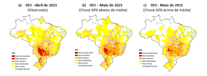 O Índice Integrado de Seca (IIS) referente ao mês de abril, se comparado ao do mês de março, aponta a intensificação da seca no Centro-Sul do Brasil. Os municípios localizados entre os estados de São Paulo e Mato Grosso do Sul (incluindo o Pantanal), e da porção oeste da região Sul, são aqueles mais críticos em relação às condições de seca observadas no mês de abril. De acordo com ambos os cenários de IIS para o mês de maio (com chuvas 30% abaixo ou 30% acima da média), as condições de seca entre moderada à severa devem permanecer em grande parte do Centro-Sul do país, principalmente nos municípios mais críticos destacados anteriormente.