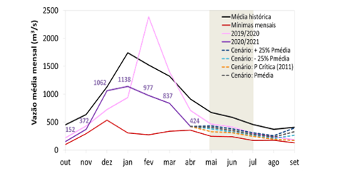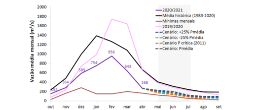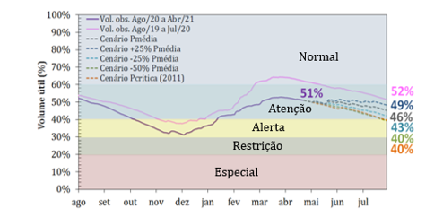 Em um cenário hipotético de chuvas na média histórica, o modelo hidrológico PDM/Cemaden [2] projeta uma vazão afluente de, aproximadamente, 69% da média para o trimestre MJJ. Ainda considerando este mesmo cenário de chuvas, o volume útil armazenado, no final de julho de 2021, deve atingir 46%, permanecendo na atual faixa de operação “Atenção”.