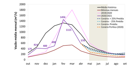 Na bacia afluente à Usina Hidrelétrica (UHE) Furnas, no Rio Grande, no mês de abril, choveu apenas 13% da média e a vazão atingiu 46% da média do mês. O armazenamento no reservatório atingiu 39% em 30 de abril de 2021, valor inferior ao registrado no mesmo período de 2020 (65%).