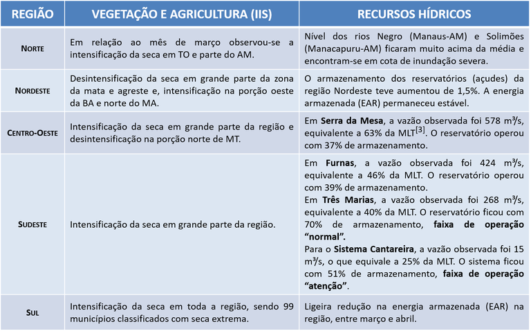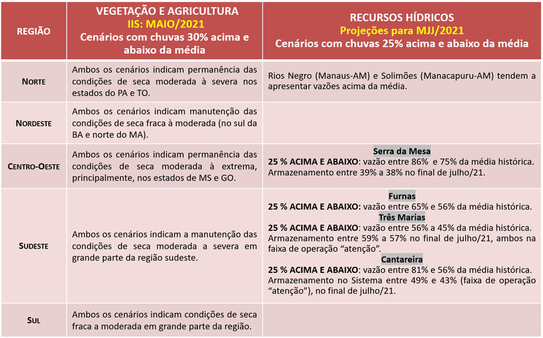 O impacto da seca nos recursos hídrico mostra que os reservatórios do Sistema Cantareira e das Usinas Hidrelétricas (UHEs) Três Marias (rio São Francisco) e Serra da Mesa (rio Tocantins), em 30 de abril de 2021, apresentaram armazenamento de 51%, 70%, e 37%, respectivamente. Considerando um cenário hipotético de chuvas na média, a projeção de vazão afluente média a estes reservatórios, no trimestre MJJ ficará abaixo da média do período (em 69%, 51% e 81%), com armazenamento no final de julho em 46%, 58% e 39%, respectivamente. Ainda no Sudeste, no reservatório da UHE Furnas, embora o volume armazenando seja similar em relação ao mês anterior (39%), a vazão registrada representa 46% em relação à média histórica, valor próximo ao mínimo histórico do mês. De acordo com o modelo hidrológico, em um cenário hipotético de chuvas na média histórica, a projeção de vazão afluente média a este reservatório, no trimestre MJJ, será de 61% da média. Com relação ao monitoramento das UHEs da região Sul, em Itaipu, e nos reservatórios de Barra Grande, Segredo e Passo Real os níveis de vazão e de armazenamento apresentaram redução no final do mês de abril em relação ao mês de março.