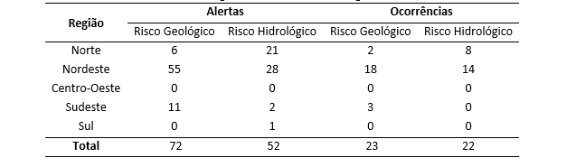 Conforme verificado na Tabela 1, no mês de abril de 2021 foram enviados pela Sala de Situação do Cemaden o total de 124 alertas para municípios monitorados, com destaque para a Região Nordeste (83 alertas – 67% do total) [1] . Em relação às ocorrências registradas para o período, estas também se concentraram na região Nordeste, com 18 eventos de risco geológico e 14 eventos de risco hidrológico.