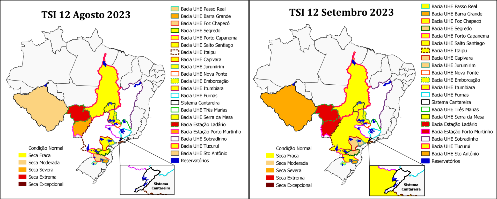 Figura 3 – Índice Padronizado Bivariado (Chuva-Vazão) - TSI-12 (Two-variate Standardize Index) - para o mês de agosto e setembro de 2023. As delimitações coloridas representam as principais bacias monitoradas ao longo do país com suas respectivas classes de seca (variando de excepcional a seca fraca) e à condição dentro da normalidade.