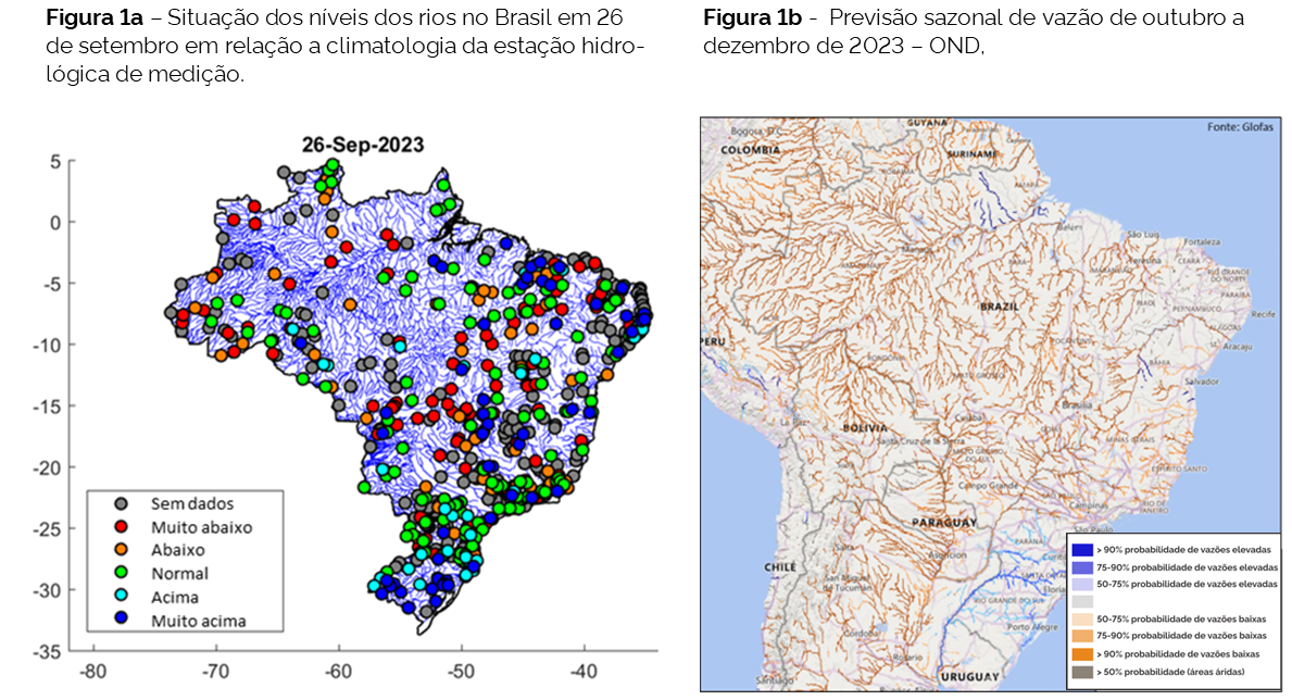 A previsão sazonal para o trimestre OND do modelo Global Flood Awareness System (GloFAS) na Figura 1b, indica a permanência de probabilidade superior a 75% para ocorrência de vazões acima da média nos rios localizados na porção nordeste da região Norte no estado do Amapá, em nos principais rios da região Sul do Brasil. Em todo o restante da região Norte, em toda a região Centro-oeste, na porção oeste da região Nordeste e em grande parte da região Sudeste do Brasil, a previsão indica probabilidade acima de 75% para vazões abaixo da média climatológica para o período e vazões dentro da média climatológica nas demais áreas do país.
