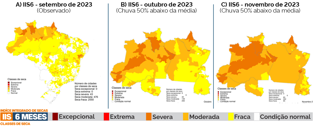 Figura 2 - Índice Integrado de Seca (IIS-6) para o Brasil, observado no mês de setembro(a) e projeções para os meses de outubro e novembro de 2023 para os estados da região norte, considerando um cenário de chuvas 50% abaixo da climatologia para o mês de outubro (b) e 50% abaixo da climatologia para o mês de novembro (c).