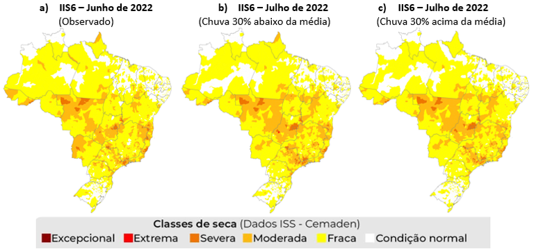 Figura 2 – Índice Integrado de Seca (IIS-6) para o Brasil, observado no mês de junho (a) e projeções para o mês de julho de 2022, considerando um cenário de chuvas 30% abaixo (b) e 30% acima da climatologia (c).