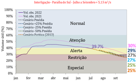 É importante ressaltar também que nessas simulações foi considerado o aporte médio de 5,13 m³/s (valor abaixo do praticado no mês de junho) proveniente da interligação entre o Sistema Paraíba do Sul e o reservatório Atibainha (reativada no dia 19 de abril de 2022), de acordo com a Resolução ANA Nº 1931. Além disso, também foi considerada vazão defluente (Q jusante) para as bacias do PCJ (rios Piracicaba, Capivari e Jundiaí) de 8,7 m³/s e 8,0 m³/s para estação seca e chuvosa, respectivamente, valores médios do período de 2020. Para maiores informações, consulte o Relatório da Situação atual e projeção hidrológica para o Sistema Cantareira – junho de 2022 ( https://www.gov.br/cemaden/pt-br/assuntos/monitoramento/monitoramento-hidrologico/relatorio-cantareira/situacao-atual-e-projecao-hidrologica-para-o-sistema-cantareira-15-07-2022-ano-8-no-70 ).