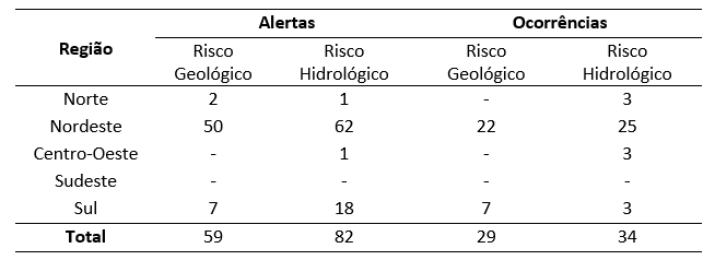 No mês de junho de 2022 foram enviados pela Sala de Situação do Cemaden um total de 141 alertas para municípios monitorados (Tabela 1), com destaque para a Região Nordeste (113 alertas, ou 80% do total) [1] . Em relação às ocorrências registradas para o período, estas também se concentraram na Região Nordeste, com 25 eventos de risco hidrológico, e 22 eventos de risco geológico.