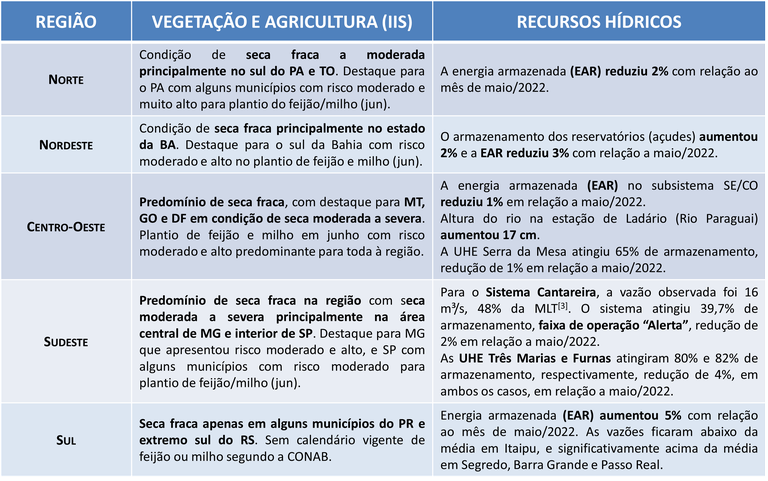 A descrição da estimativa do IIS e a avaliação dos impactos de secas a nível nacional e também na agricultura familiar, referente ao mês de junho, podem ser consultados, respectivamente: no Boletim de Monitoramento de Secas e Impactos no Brasil ( https://www.gov.br/cemaden/pt-br/assuntos/monitoramento/monitoramento-de-seca-para-o-brasil/monitoramento-de-secas-e-impactos-no-brasil-2013-junho-2022 ) e Boletim de Monitoramento do Risco de Seca com foco na Agricultura Familiar ( https://www.gov.br/cemaden/pt-br/assuntos/monitoramento/seca-na-agricultura-familiar/risco-de-seca-na-agricultura-familiar-junho-2022 ).