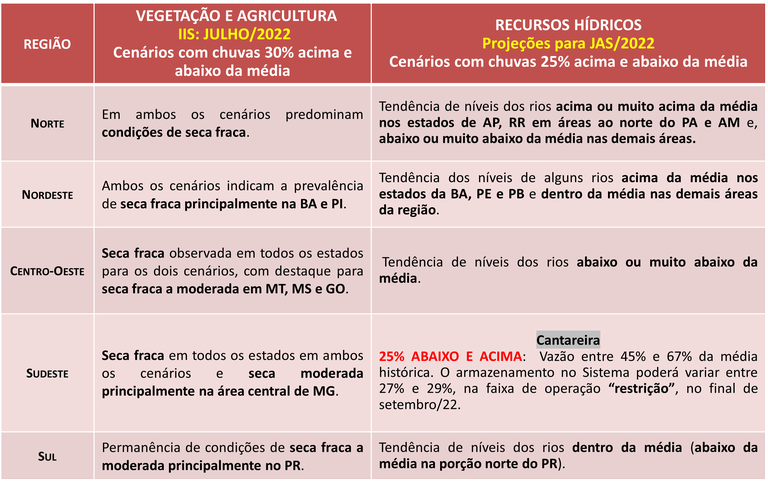 Na porção norte da região Norte, porção leste da região Nordeste e grande parte da região do Sul do Brasil a maioria das estações hidrológicas disponíveis registraram níveis dos rios acima ou muito acima da média climatológica para o período. Na região Centro-Oeste e na porção oeste das regiões Norte, Nordeste e Sudeste, várias estações apresentam níveis abaixo ou muito abaixo da média e por fim rios dentro da média nas demais áreas do país. A previsão sazonal para o trimestre JAS indica tendência de vazões superiores à média nos rios localizados na porção norte da região Norte e porção leste da região Nordeste, entre os estados da Paraíba, Pernambuco, Alagoas e Bahia, vazões abaixo ou muito abaixo da média em grande parte da região Centro-Oeste, na porção oeste das regiões Nordeste e Sudeste, e vazões dentro da média nas demais áreas do Brasil.