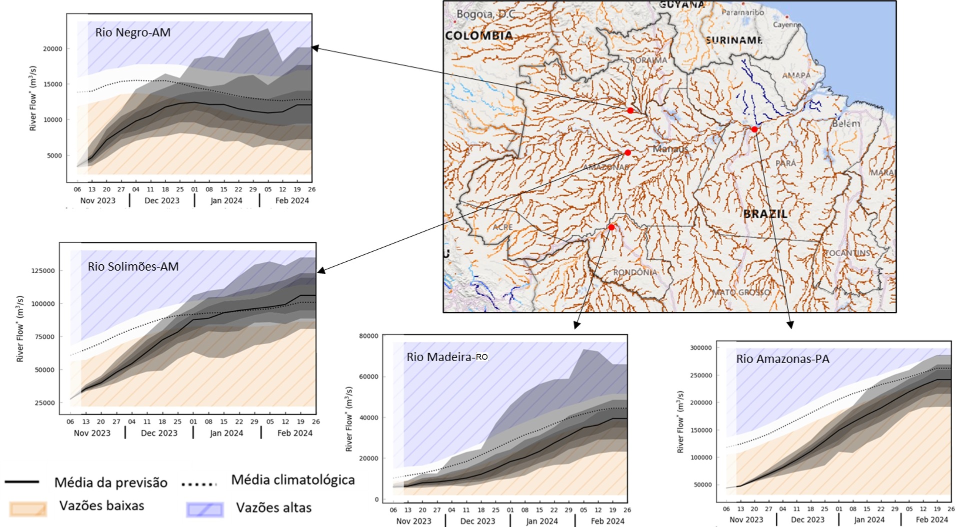 Segundo previsão de vazão do modelo GloFas (Figura 4), em escala sazonal, indica vazões abaixo da média climatológica ao longo do trimestre NDJ, nos seguintes municípios: Barcelos (Estado do Amazonas) no rio Negro; Porto Velho (Estado de Rondônia) no rio Madeira; Monte Alegre (Estado do Pará) no rio Amazonas. Há indicativo, segundo previsão do GloFas, que apenas na região do município de Coari (Estado do Amazonas), à montante do município de Manaus, no rio Solimões, as vazões venham a atingir valores médios de vazão entre os meses de janeiro e fevereiro de 2024.