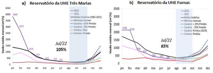 Ainda na região Sudeste, no mês de julho, na bacia afluente à Usina Hidrelétrica (UHE) Três Marias, localizada no alto São Francisco (MG), não foi registrado valor significativo de precipitação (média histórica = 9 mm). Adicionalmente, a vazão foi de 252 m³/s, o que representa em termos percentuais, 105% da média histórica do período (Figura 4a). O armazenamento no reservatório atingiu, em 31 de julho, 76% do volume útil, na faixa de operação “Normal” (armazenamento entre 60% a 100%). Este valor é 4% inferior ao volume armazenado no mês de junho e, adicionalmente representa uma situação melhor à registrada no mesmo período de 2021 (55%).