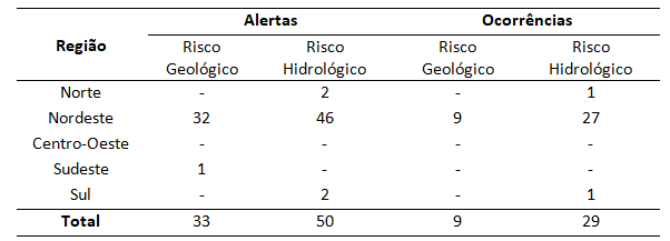 No mês de julho de 2022 foram enviados pela Sala de Situação do Cemaden um total de 83 alertas para municípios monitorados (Tabela 1), com destaque para a Região Nordeste (78 alertas, ou 94% do total) [1] . Em relação às ocorrências registradas para o período, estas também se concentraram na Região Nordeste, com 9 eventos de risco hidrológico, e 27 eventos de risco geológico.