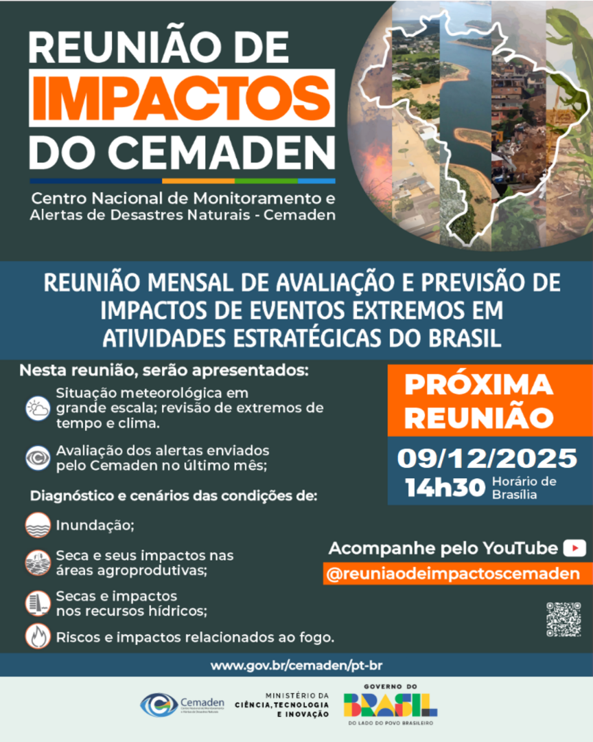 As Reuniões Mensais de Avaliação e Previsão de Impactos de Extremos de Origem Hidro-Geo-Climático em Atividades Estratégicas para o Brasil são organizadas pelo Centro Nacional de Monitoramento e Alertas de Desastres Naturais (CEMADEN), Unidade de Pesquisa do Ministério da Ciência, Tecnologia e Inovação (MCTI).