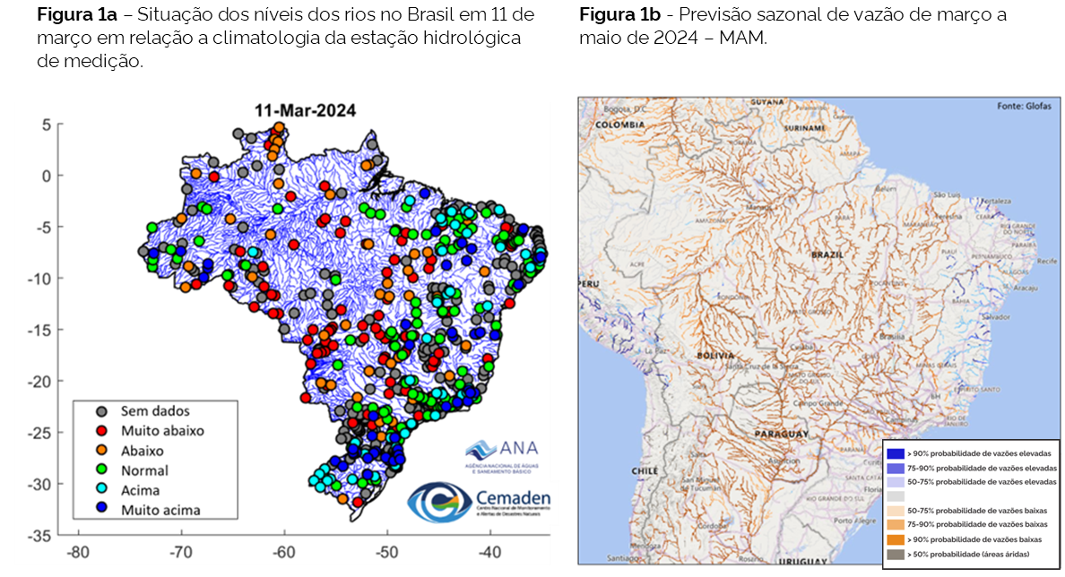 A situação dos níveis dos principais rios do Brasil em relação à média climatológica das estações hidrológicas da Agência Nacional de Águas e Saneamento Básico - ANA, para o dia 11 de março de 2024 é apresentada na Figura 1a. Observa-se que os rios na porção oeste da região Norte e porção leste das regiões Nordeste e Sudeste e na porção norte da região Sul do Brasil encontram-se com níveis acima ou muito acima da média climatológica. Na porção oeste da região Norte e grande parte da região Centro-Oeste do Brasil apresentam níveis abaixo ou muito abaixo da climatologia e, rios dentro da média climatológica nas demais áreas do Brasil.
