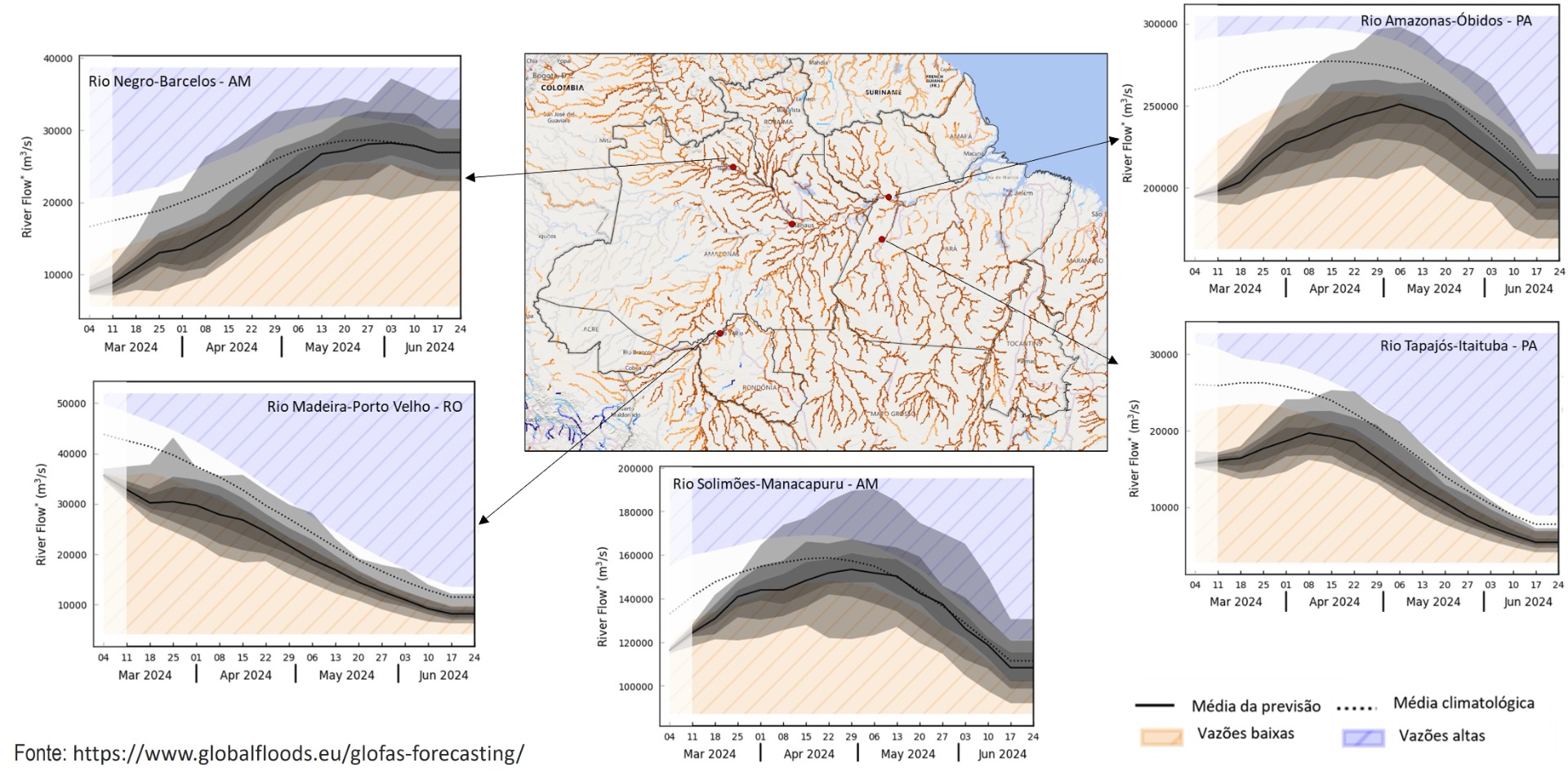 Segundo previsão de vazão do sistema Global Flood Awareness System (GloFas) (Figura 4), em escala sazonal, indica uma recuperação dos níveis dos rios na bacia do Amazonas, porém, ainda com vazões abaixo da média climatológica ao longo do trimestre MAM nos seguintes municípios: Porto Velho (Estado de Rondônia) no rio Madeira; Itaituba (Estado do Pará) no rio Tapajós; e Óbidos (Estado do Pará) na porção mais a jusante do rio Amazonas.
