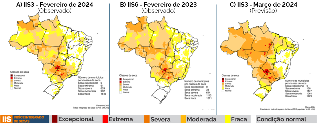 O Índice Integrado de Seca (IIS3) previsto para o mês de março indica que as condições de seca podem piorar sobretudo no Centro-Oeste do Brasil e parte do Sudeste, em especial entre os estados de São Paulo, Goiás, Mato Grosso do Sul e Minas Gerais. De acordo com o índice, 1177 municípios do Brasil poderão ser classificados com seca severa e 138 com seca extrema.
