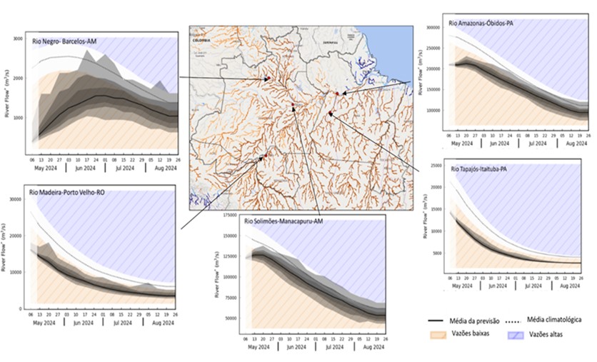 Figura 4. Previsão sazonal (4 meses) de vazão (m3/s) para a região da bacia do rio Amazonas, segundo o modelo Global Flood Awareness System (GloFAS) acoplado ao modelo meteorológico do European Centre for Medium-Range Weather Forecasts (ECMWF).