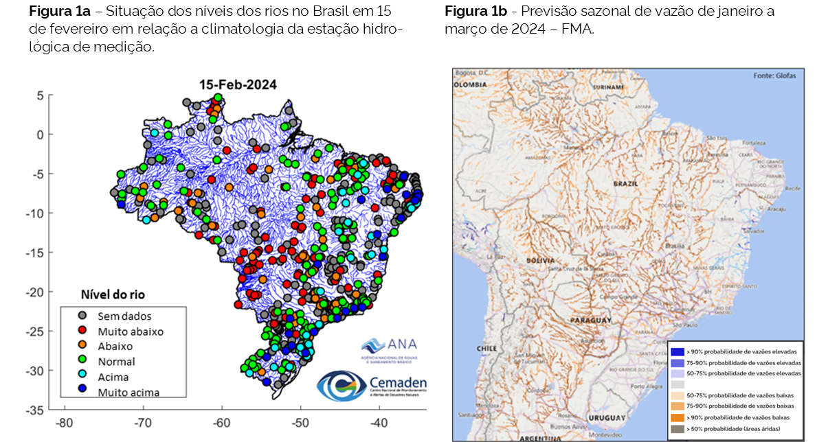 A situação dos níveis dos principais rios do Brasil em relação à média climatológica das estações hidrológicas da Agência Nacional de Águas e Saneamento Básico - ANA, para o dia 15 de fevereiro de 2024 é apresentada na Figura 1a. Observa-se que os rios na porção leste das regiões Nordeste e Sudeste e em grande parte da região Sul do Brasil encontram-se com níveis acima ou muito acima da média climatológica. Na porção central da região Norte e grande parte da região Centro-Oeste do Brasil apresentam níveis abaixo ou muito abaixo da climatologia e, rios dentro da média climatológica nas demais áreas do Brasil.