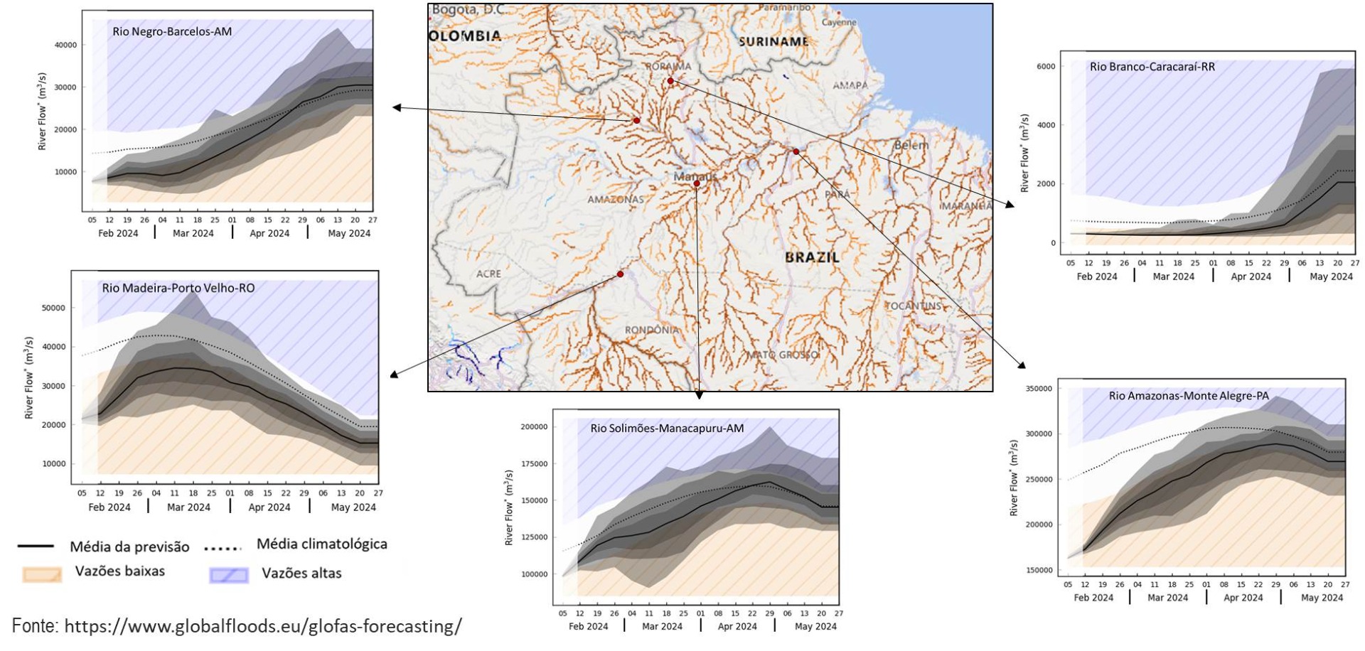 Segundo previsão de vazão do modelo GloFas (Figura 4), em escala sazonal, indica uma recuperação dos níveis dos rios na bacia do Amazonas, porém, ainda com vazões abaixo da média climatológica ao longo do trimestre FMA nos seguintes municípios: Porto Velho (Estado de Rondônia) no rio Madeira; Caracaraí (Estado de Roraima) no rio Branco e Monte Alegre (Estado do Pará) no rio Amazonas.
