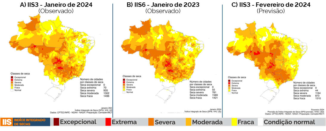 O Índice Integrado de Seca (IIS3 e 6) referente ao mês de janeiro mostra condições de seca severa e extrema nos estados da região Norte, Goiás, Mato Grosso, São Paulo e Minas Gerais. Na escala de 3 meses, é importante destacar que 935 municípios do Brasil estão classificados com seca severa e 70 com seca extrema.
