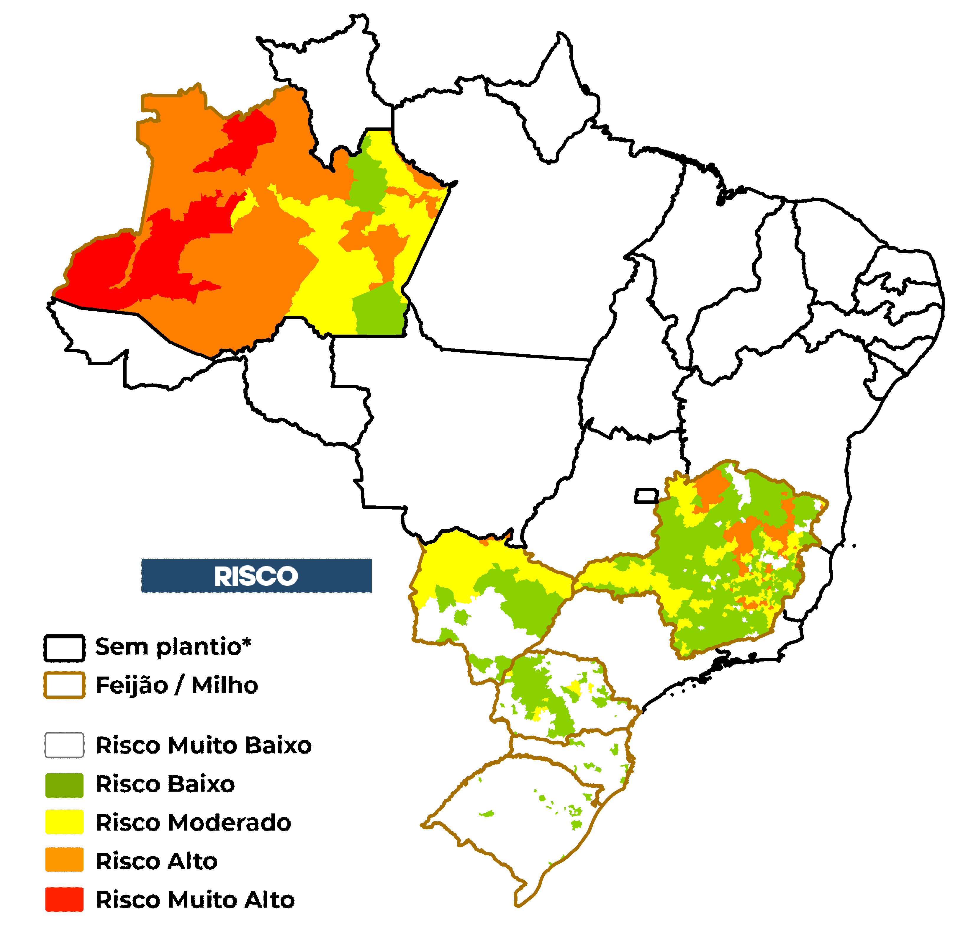 O risco de seca na agricultura familiar é avaliado considerando o cultivo de feijão e/ou milho não irrigados. O risco considera a exposição ao déficit hídrico associada às vulnerabilidades e capacidades adaptativas de cada município em relação ao sistema de agricultura familiar. Além disso, é utilizado o calendário agrícola disponibilizado pela CONAB*.