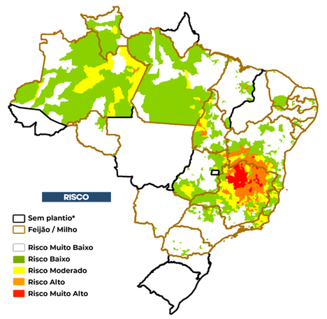 O risco de seca na agricultura familiar é avaliado considerando o cultivo de feijão e/ou milho não irrigados. O risco considera a exposição ao déficit hídrico associada às vulnerabilidades e capacidades adaptativas de cada município em relação ao sistema de agricultura familiar. Além disso, é utilizado o calendário agrícola disponibilizado pela CONAB*.