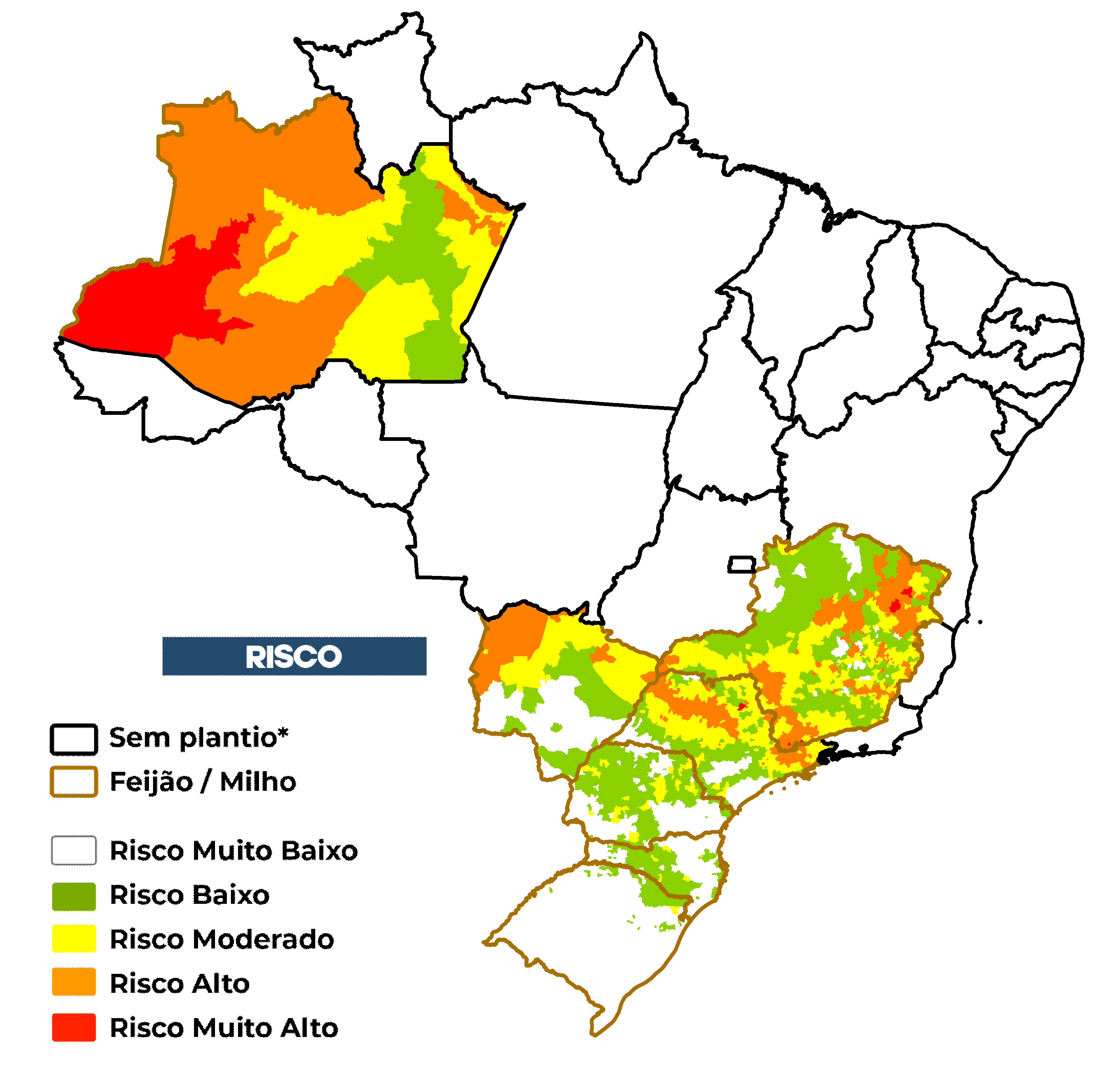 O risco de seca na agricultura familiar é avaliado considerando o cultivo de feijão e/ou milho não irrigados. O risco considera a exposição ao déficit hídrico associada às vulnerabilidades e capacidades adaptativas de cada município em relação ao sistema de agricultura familiar. Além disso, é utilizado o calendário agrícola disponibilizado pela CONAB*.