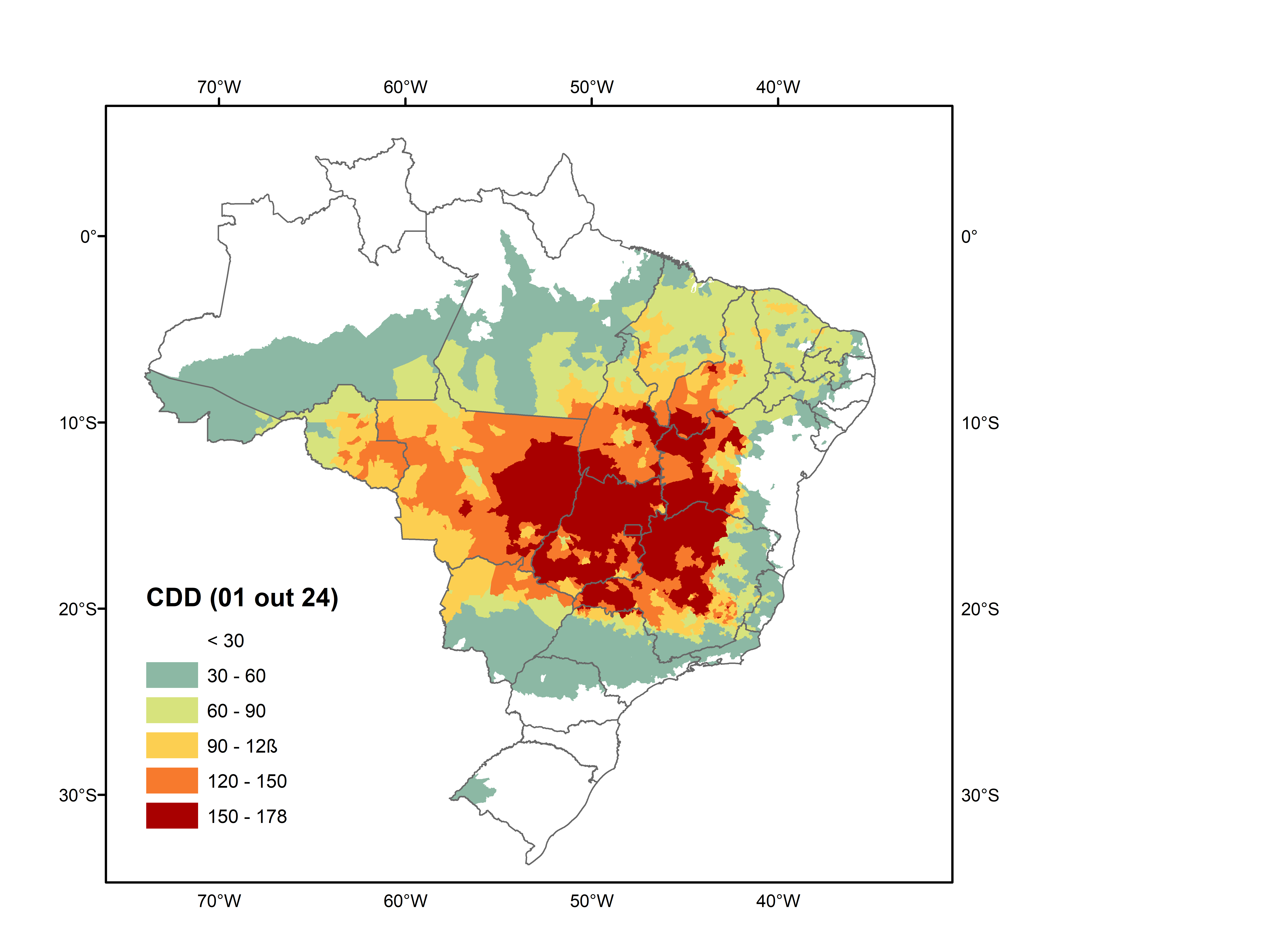 A projeção do Índice Integrado de Seca (IIS) para outubro de 2024 alerta para o agravamento da seca em diversas regiões do Brasil. Destaque para a expansão dos municípios com condição de seca extrema, sendo estes localizados no Amazonas (11 municípios), Mato Grosso (50 municípios), Mato Grosso do Sul (11 municípios) e Goiás (20 municípios).