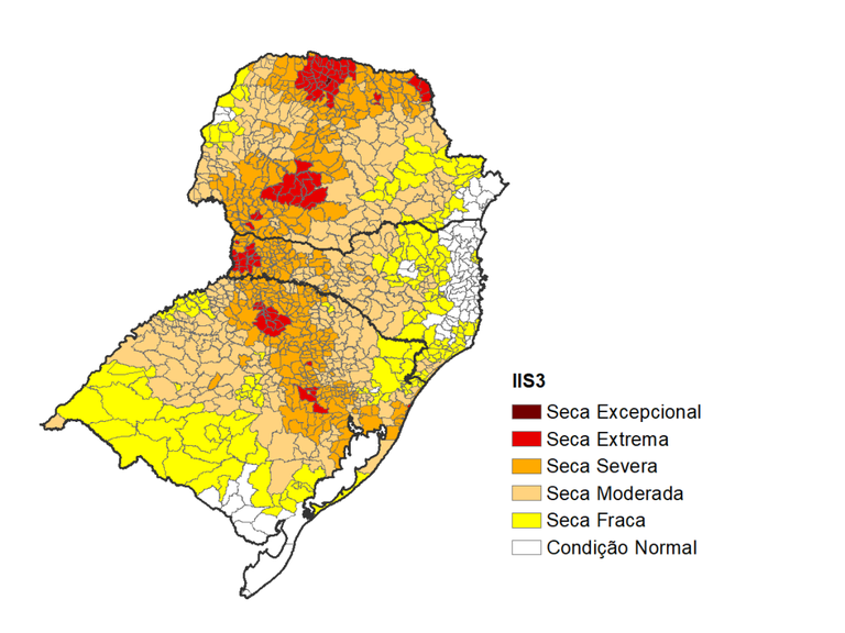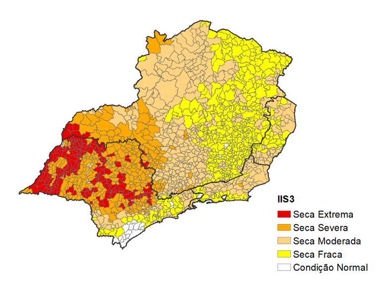 Para integrar o IIS, o SPI é calculado a partir de dados observacionais de precipitação disponíveis no CEMADEN, no Instituto Nacional de Meteorologia (INMET), no Instituto Nacional de Pesquisas Espaciais (INPE) e Centros Estaduais de Meteorologia. O cálculo do SPI é baseado na formulação proposta por Mckee et al. (1993), considerando as escalas de 3, 6 e 12 meses, obtendo-se o produto final na resolução espacial de 5km. O IIS possui as seguintes classes: condição normal (6), seca fraca (5), seca moderada (4), seca severa (3), seca extrema (2) e seca excepcional (1).