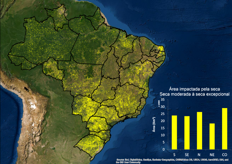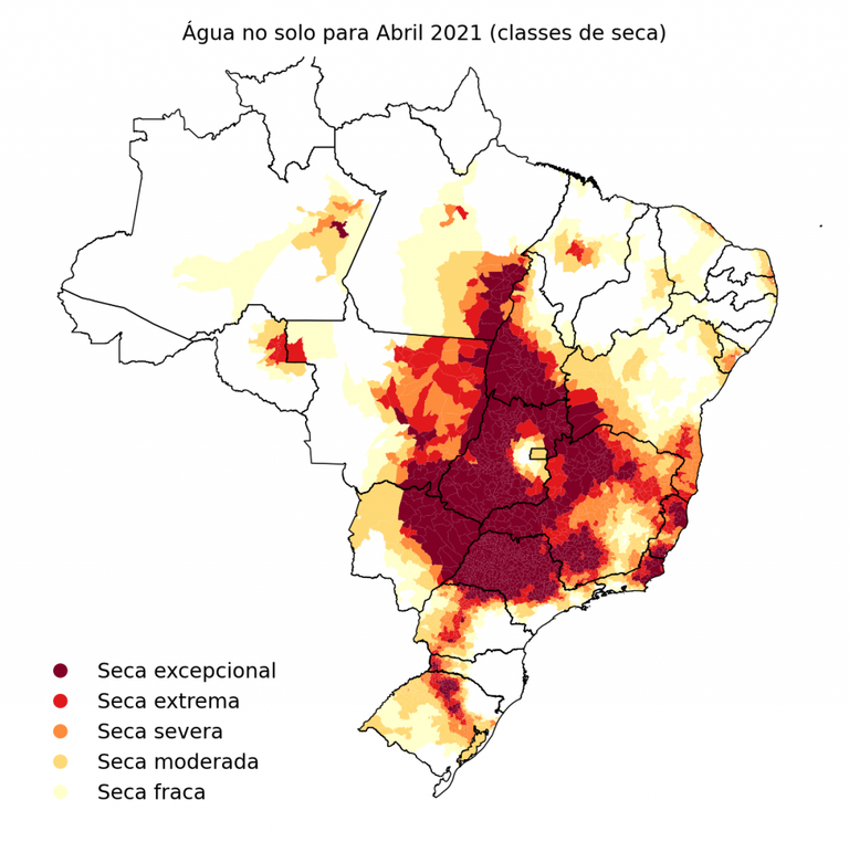 As classes de seca baseadas na umidade do solo para o mês de abril de 2021 são mostradas na Figura. Os estados mais afetados com seca excepcional são Pará, Mato Grosso, Tocantins e Goiás. Adicionalmente, partes de São Paulo, Minas Gerais, Rio de Janeiro, Espírito Santo, Mato Grosso do Sul e Bahia também apresentaram baixos níveis de água no solo e seca excepcional.