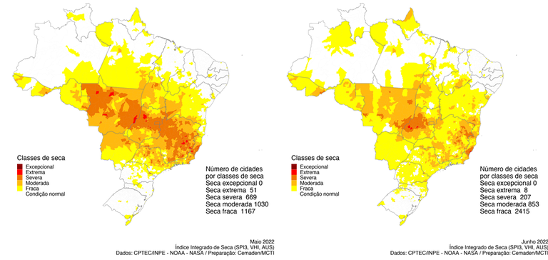 Índice Integrado de Seca (IIS) referente ao mês de junho de 2022 nas escalas: 3 meses (IIS-3, esquerda) e 6 meses (IIS-6, direita).