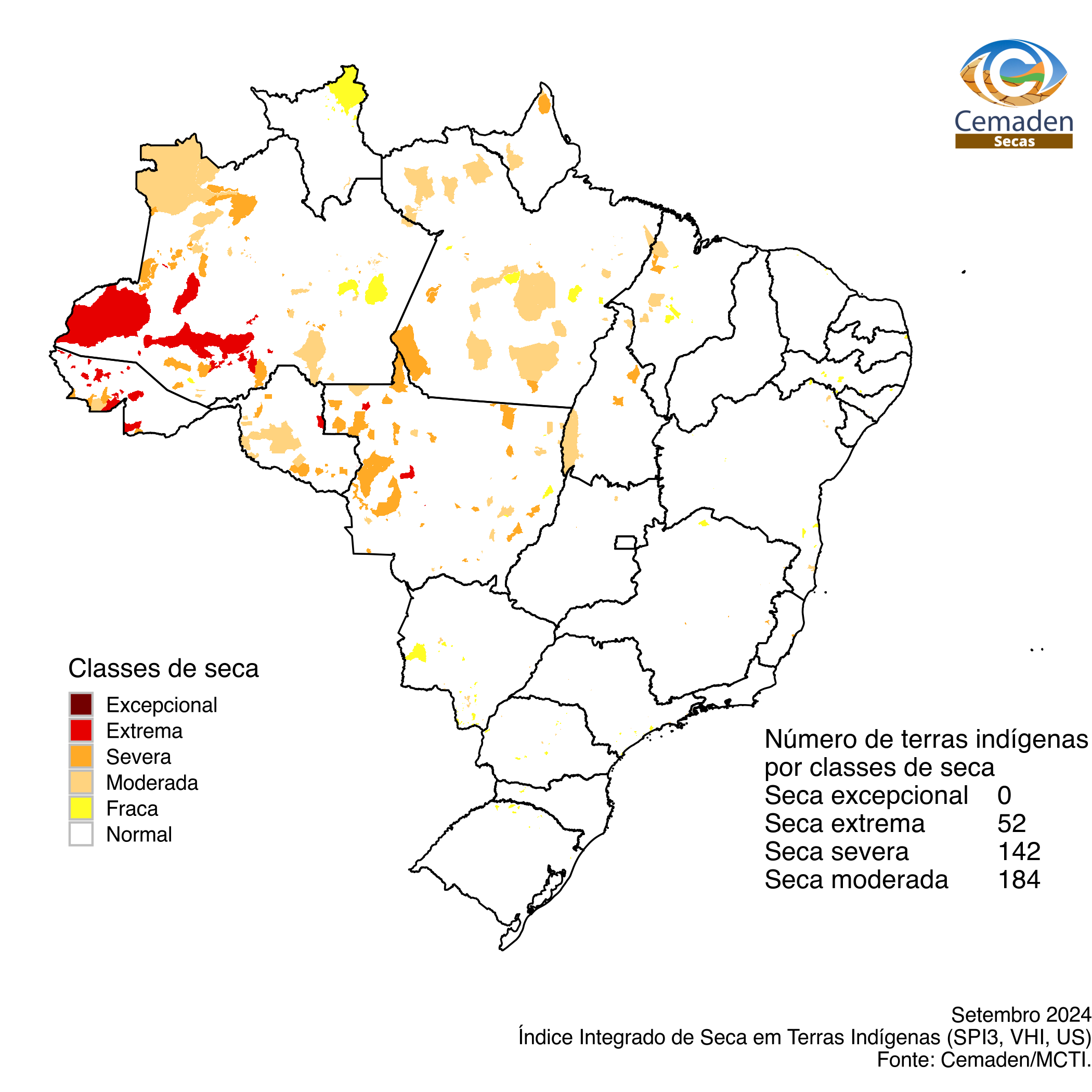 De acordo com os dados do IIS para o mês de agosto, 52 terras indígenas estão classificadas com condição de seca extrema (aumento em relação ao mês de agosto) e outras 142, com seca severa (aumento em relação ao mês de agosto), sendo a maior parte dessas localizadas nas regiões Norte e Centro-Oeste.