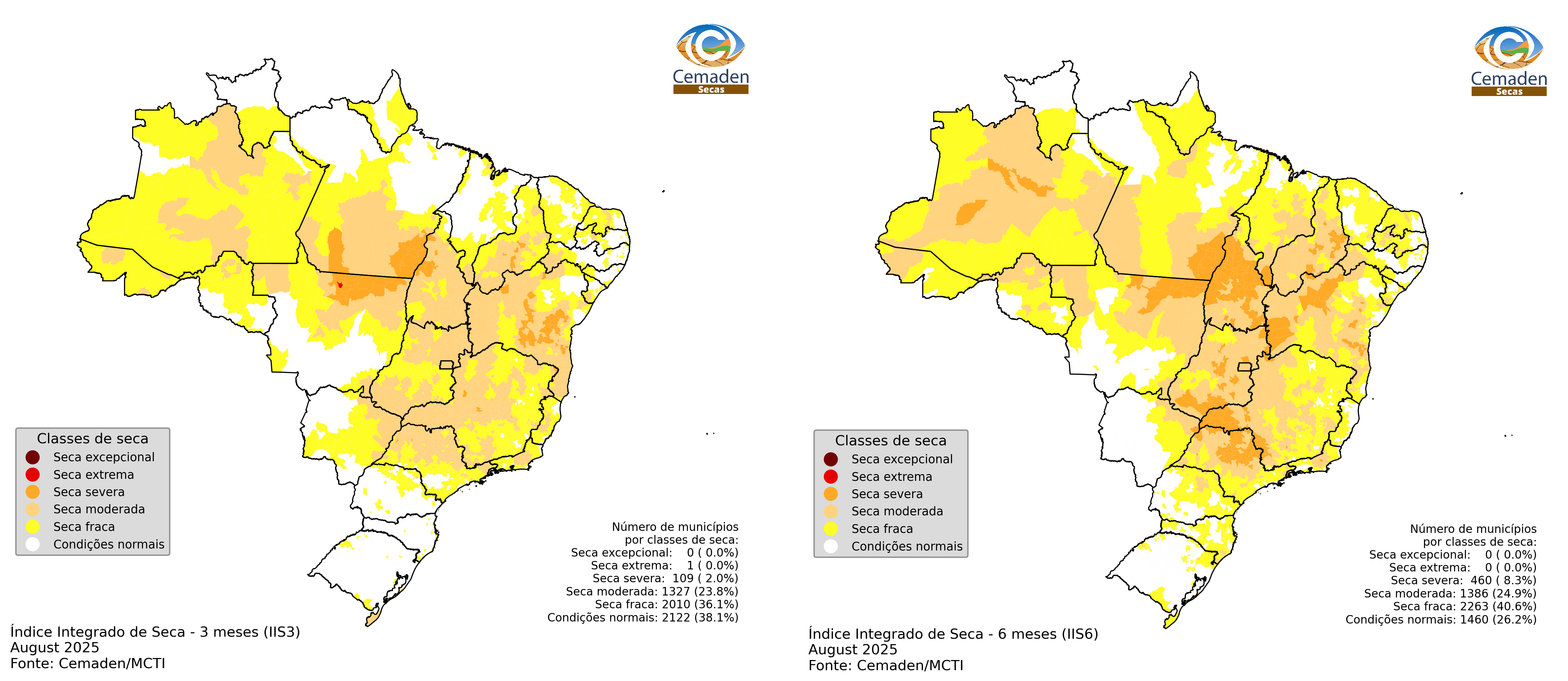 De acordo com o Índice Integrado de Secas (IIS), em comparação a julho, o cenário de seca apresentou redução no número de municípios em situação mais crítica. No recorte de 3 meses, a seca severa caiu de 148 municípios em julho para 109 em agosto, enquanto a seca moderada passou de 1331 para 1327 municípios e a seca fraca reduziu de 2350 para 2010. Apenas um município (NOVA GUARITA-MT) permaneceu em condição de seca extrema, sem registro de seca excepcional.