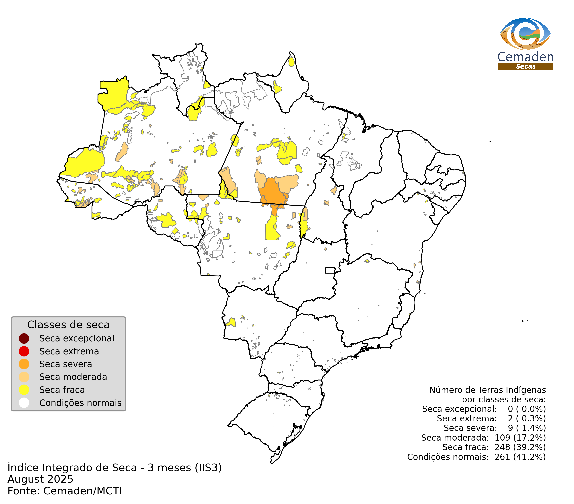 Com base no monitoramento de secas em terras indígenas, observa-se uma redução no número de áreas potencialmente afetadas por seca de intensidade moderada a extrema entre os meses de julho e agosto. Essa tendência de melhora relativa acompanha o cenário geral de suavização das condições de seca verificado no período.