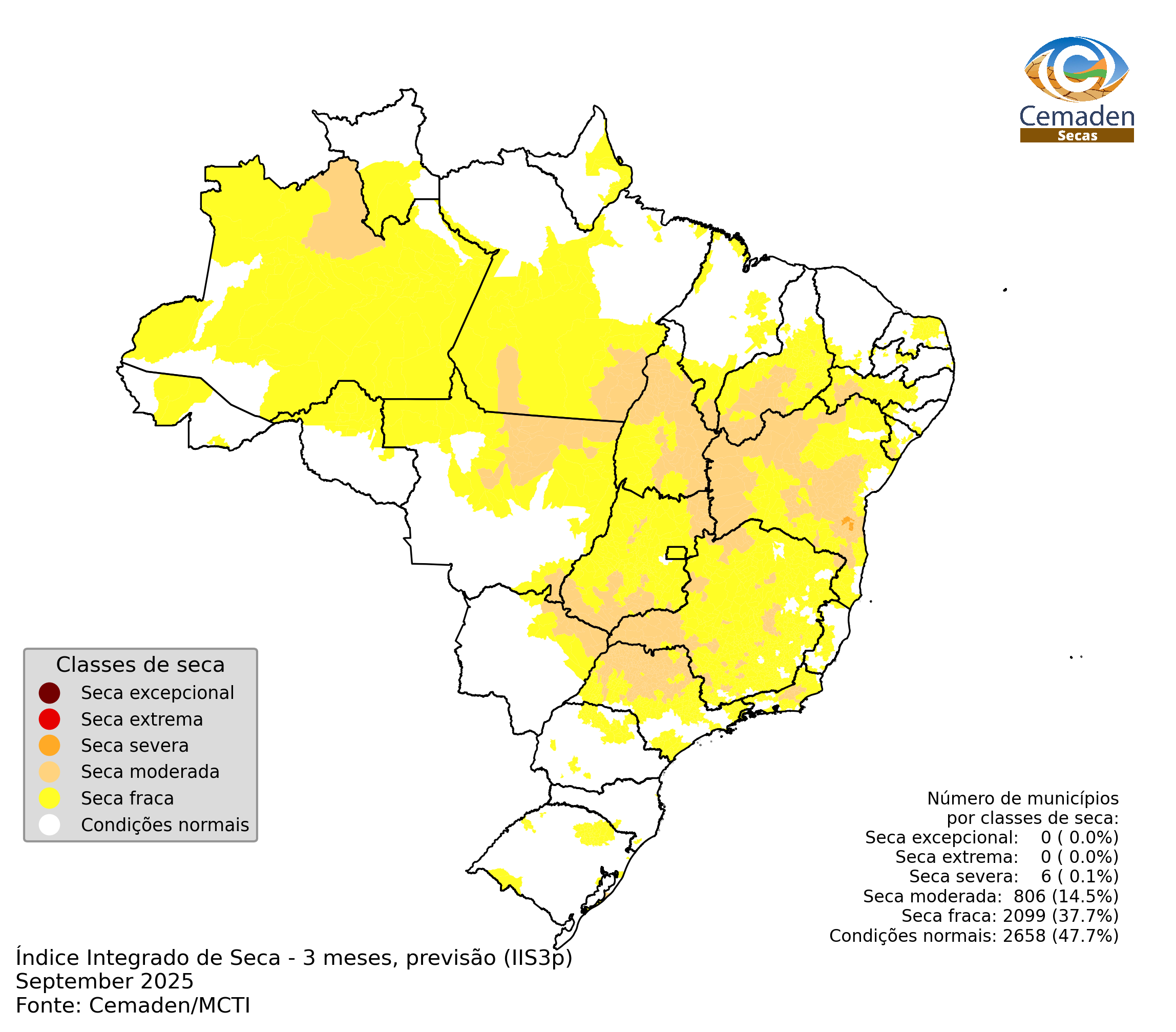 As projeções do Índice Integrado de Seca (IIS-3) para o final de setembro de 2025 indicam uma redução no número de municípios com seca moderada a extrema, sinalizando uma tendência de atenuação da situação de seca em todo o país.