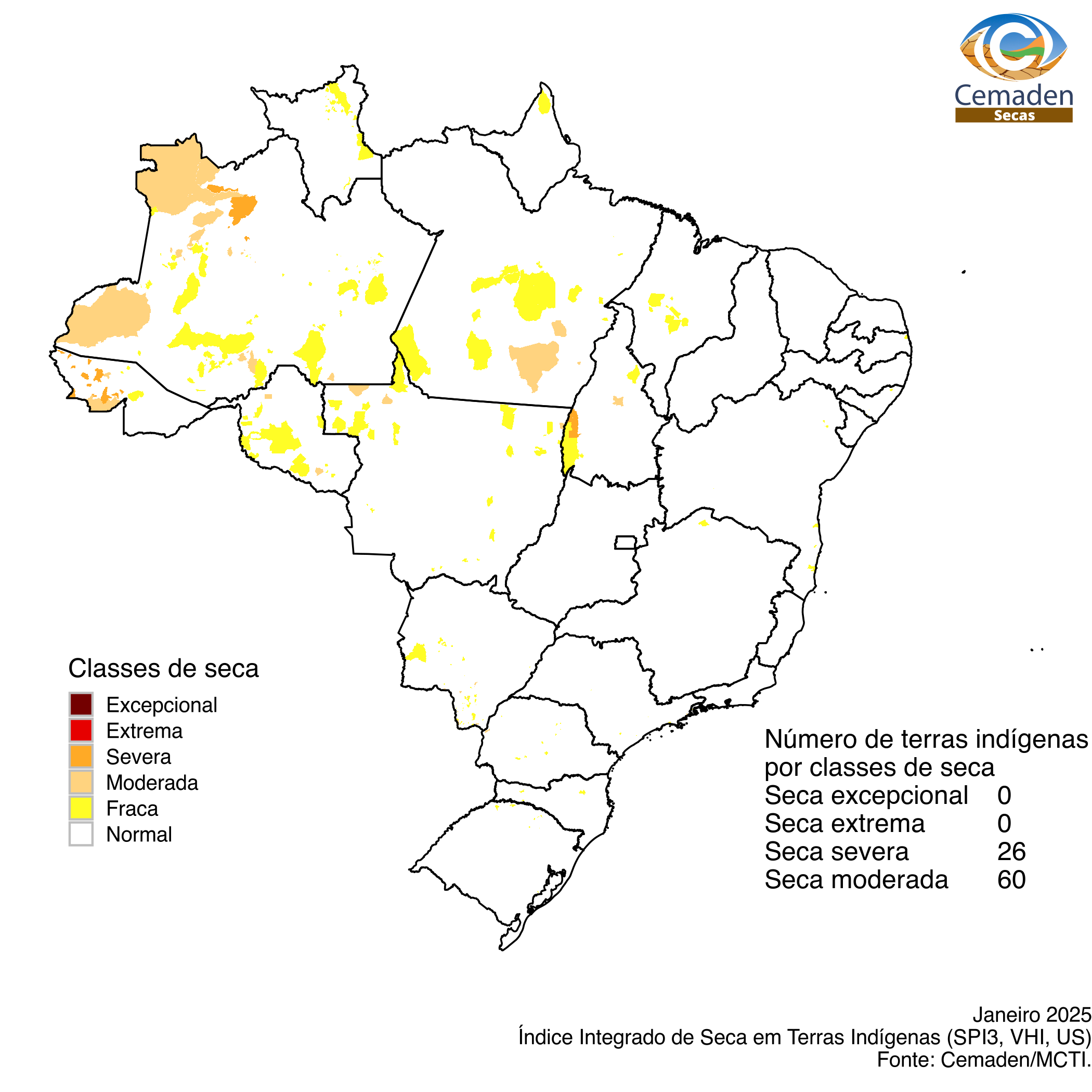 Em janeiro de 2025, houve uma redução no número de terras indígenas afetadas pela seca extrema, passando de quatro em dezembro para nenhuma. As terras indígenas em condição de seca severa também diminuíram, de 33 em dezembro para 26 em janeiro. Essa redução acompanha a tendência de amenização da seca observada em algumas regiões do país.