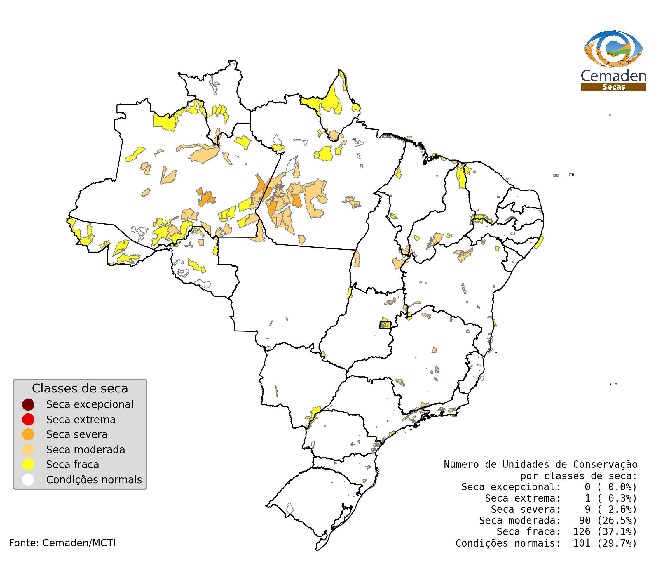Em relação às áreas de conservação, entre os meses de junho e julho observou-se uma redução das áreas em condição de seca severa e um aumento daquelas com seca moderada. Apesar dessa tendência de diminuição da intensidade, ainda permanecem 100 Unidades de Conservação em condição de seca moderada a extrema.