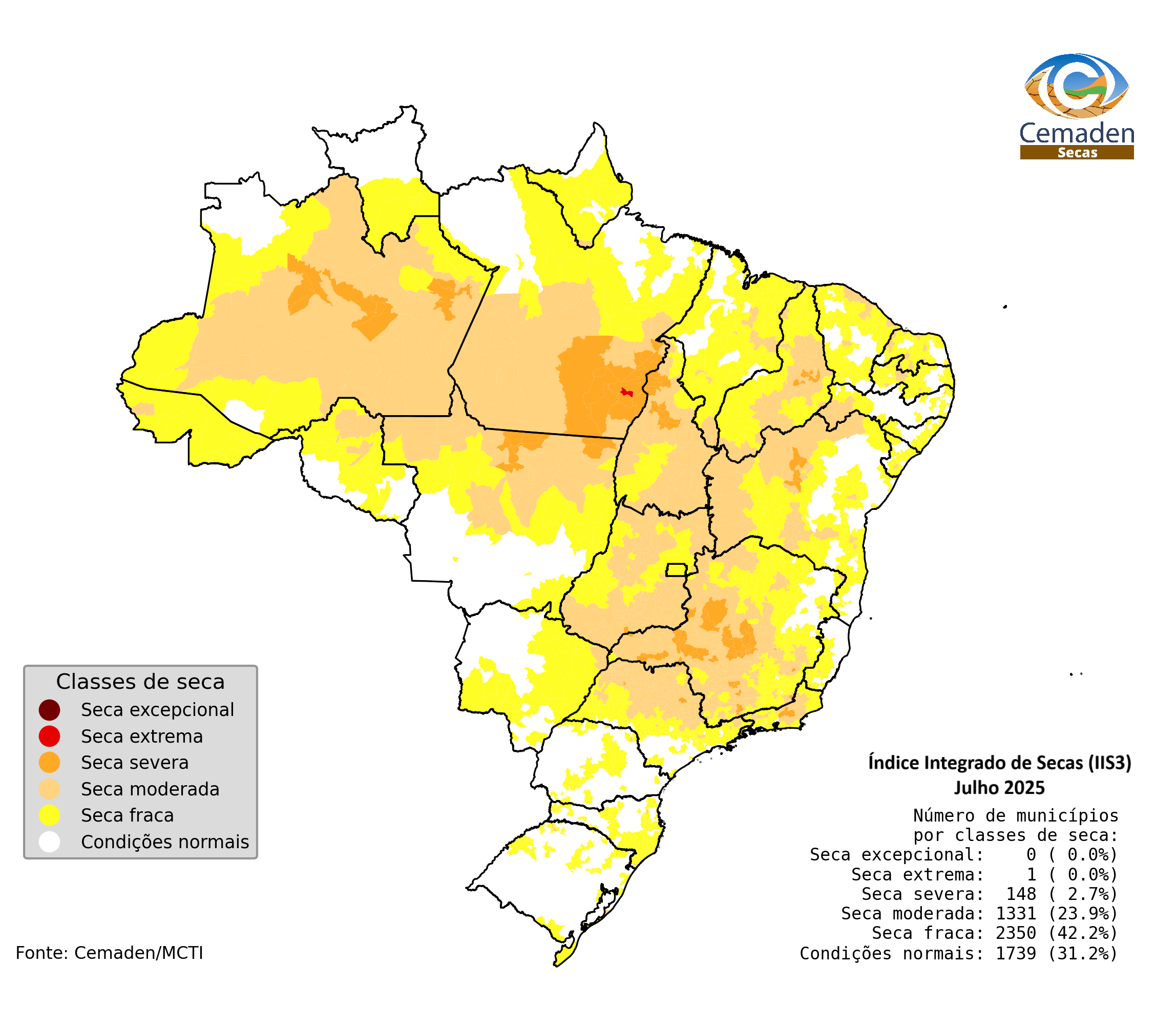 De acordo com o Índice Integrado de Secas (IIS), o número de municípios em situação de seca severa subiu de 101, em junho, para 148, em julho, mantendo um corredor de deficit hídrico que se estende pelo Sudeste, por trechos do Centro-Oeste e pelo Norte do país. Já os municípios com seca moderada a extrema passaram de 1.018 para 1.480, sobretudo em Minas Gerais, Goiás, Bahia, Rondônia e Tocantins. Quanto à seca severa, o aumento foi mais expressivo no Nordeste, enquanto a Região Norte apresentou redução.