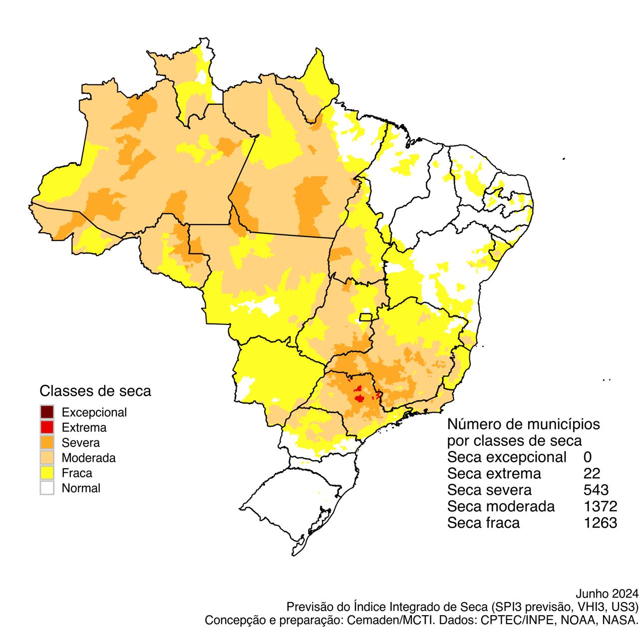 O Índice Integrado de Seca (IIS3) referente ao mês de maio indica municípios com condições de seca severa distribuídos principalmente nos estados das regioes Norte, Centro-Oeste e no interior de São Paulo. De acordo com o índice, 12 municípios do interior de São Paulo estão classificados como seca extrema, 227 municípios distribuídos entre as regiões Centro-Oeste e Norte estão classificados com condições de seca severa (4 no Amazonas, 5 no Pará, 7 no Amapá, 8 em Tocantins, 6 em Minas Gerais, 163 em São Paulo, 9 no Paraná, 3 no Mato Grosso do Sul, 3 no Mato Grosso e 2 em Goiás).