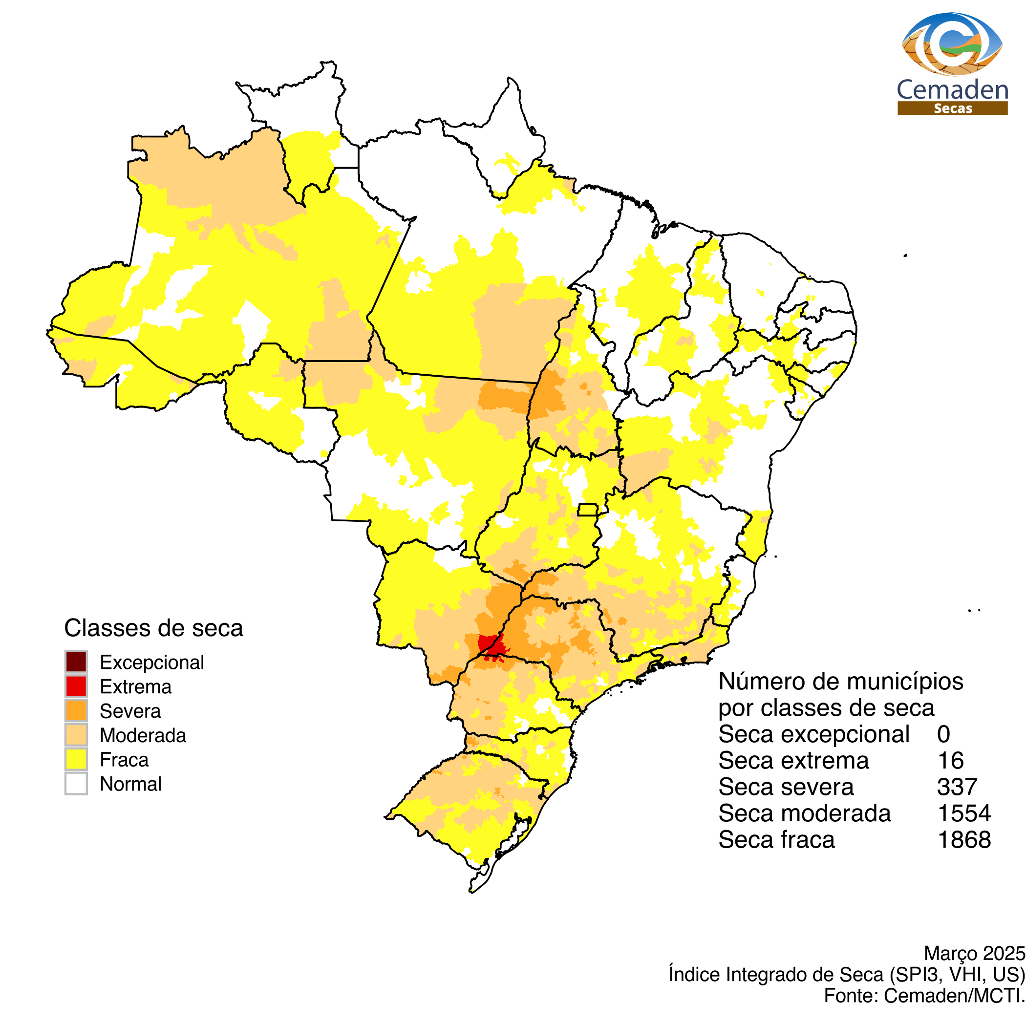 Na Nota Técnica, apresenta-se a avaliação da criticidade da seca no território brasileiro durante o período de outubro de 2024 a março de 2025, que corresponde à estação chuvosa na maior parte do país. A análise contempla a duração, extensão, intensidade e os impactos da seca em diferentes setores, como a agropecuária, terras indígenas e os recursos hídricos.