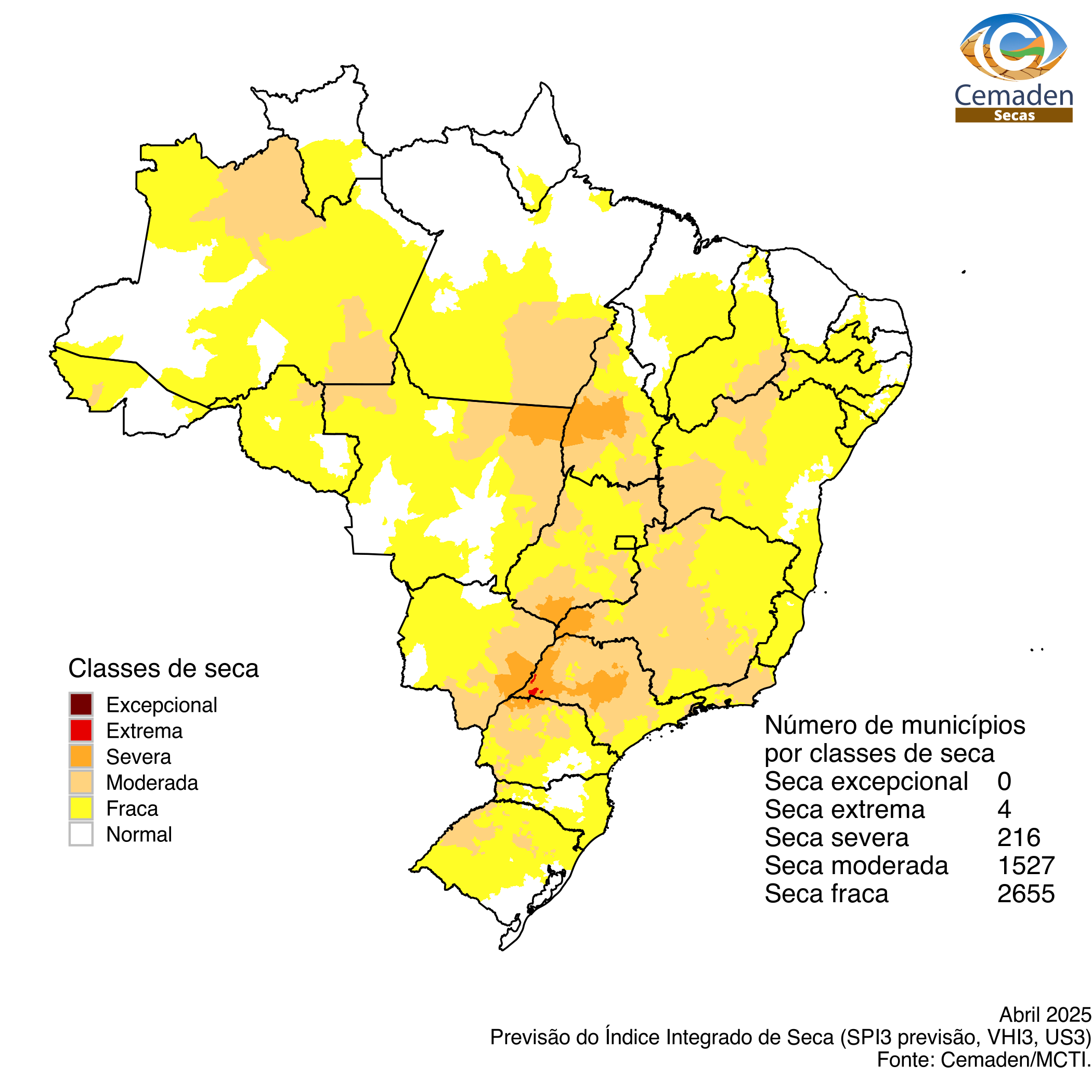 As projeções do Índice Integrado de Seca (IIS-3) para o final de abril de 2025 indicam um cenário divergente entre regiões brasileiras. Embora se espere uma redução de 40-60% no número de municípios em situação de seca moderada a extrema no Centro-Sul do país e em partes da Região Norte, observa-se a intensificação da seca, particularmente em Minas Gerais, Bahia, Piauí e Goiás.