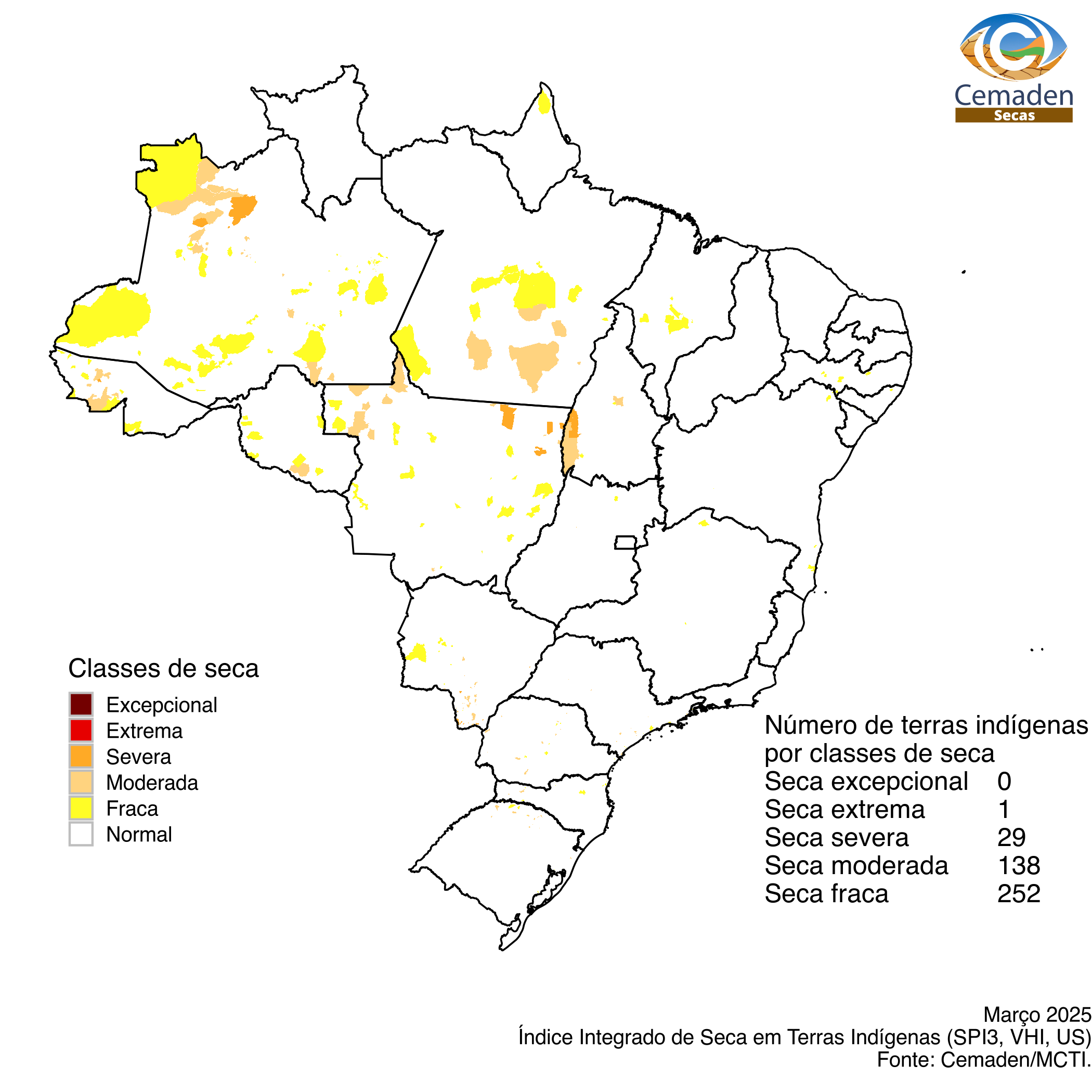 O monitoramento da seca em terras indígenas aponta para um agravamento das condições no mês de março de 2025. O número de áreas afetadas por seca moderada a extrema quase dobrou, passando de 88 em fevereiro para 168 em março. Entre os casos mais críticos, destaca-se a Terra Indígena localizada no município de Japorã (MS), que foi classificada com seca extrema no período.