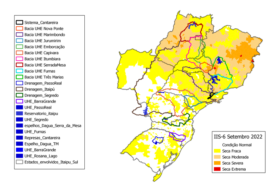 O IIS-6 (Figura 5) para as bacias afluentes aos reservatórios das UHEs Serra da Mesa (CentroOeste) bem como Furnas e Três Marias (Sudeste) apresenta uma situação de seca variando de fraca a severa. Na bacia do rio Paraná, afluente à UHE Itaipu, o IIS-6 aponta para uma condição variando de normal à seca severa. Ressalta-se que, a porção ao sul da bacia do rio Paraná se encontra numa condição melhor que as regiões de cabeceira, ao norte. Para as sub-bacias das UHEs localizadas na bacia do rio Paraná, como, Emborcação, Itumbiara, Marimbondo, Jurumirim, Nova Ponte e Capivara, o IIS-6 também apresenta condição variando entre normal (em grande parte da sub-bacia de Capivara) e seca severa (na porção leste da sub-bacia de Nova Ponte). Nas bacias localizadas mais ao Sul do país, incluindo as UHEs Segredo, Barra Grande e Passo Real, pode ser observada uma condição variando de normal à fraca, condição similar ao mês anterior.
