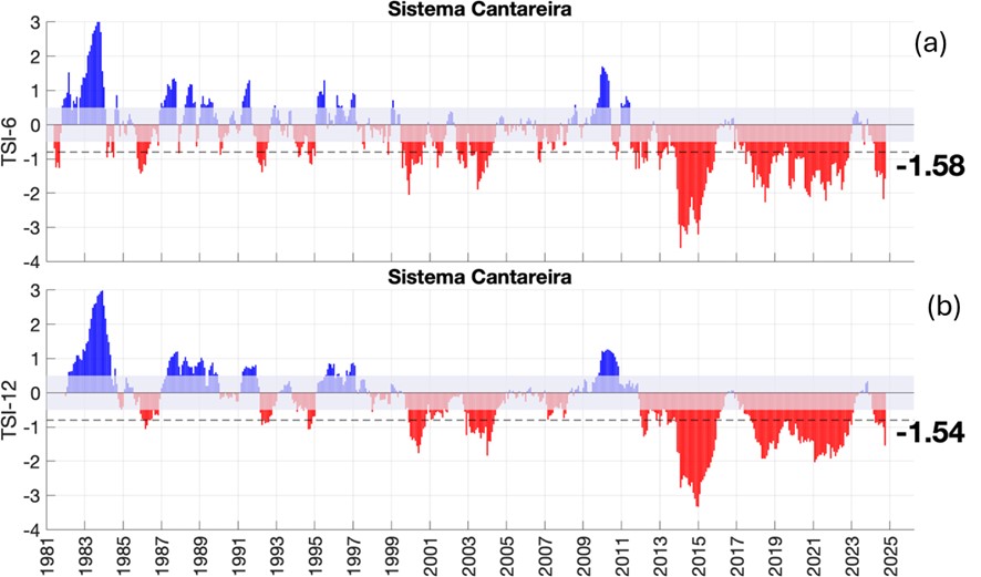 O Sistema Cantareira encontra-se classificado em condição de seca hidrológica severa, de acordo com o Índice Padronizado Bivariado Precipitação-Vazão (TSI) para as escalas temporais de 6 e 12 meses (TSI-6 = -1,58; TSI-12 = -1,54, respectivamente) (Figura 2a e 2b). Ainda de acordo com o TSI, a atual condição no Sistema Cantareira representa uma desintensificação da seca com relação ao mês anterior na escala temporal de 6 meses (seca hidrológica excepcional), mas agravamento na escala temporal de 12 meses (seca hidrológica moderada). Ressalta-se que, embora uma condição de normalidade tenha prevalecido na bacia entre março de 2023 a fevereiro de 2024, o Sistema Cantareira tem enfrentado condições de seca hidrológica crítica desde o início de 2012, variando de fraca a excepcional (à exceção dos meses entre maio e 2016 e maio de 2017).